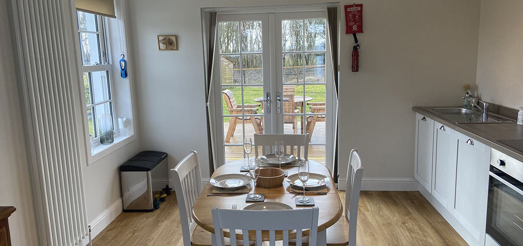 The single story cottage consists of a kitchen dining room, which gives out onto the south facing decking and hot tub where there is also an outdoors dining table and chairs with barbecue for al fresco eating. The kitchen is fully equipped with cutlery, crockery, glasses, pots, pans, electric cooker, dishwasher, fridge freezer, electric kettle, table mats and tea towels.