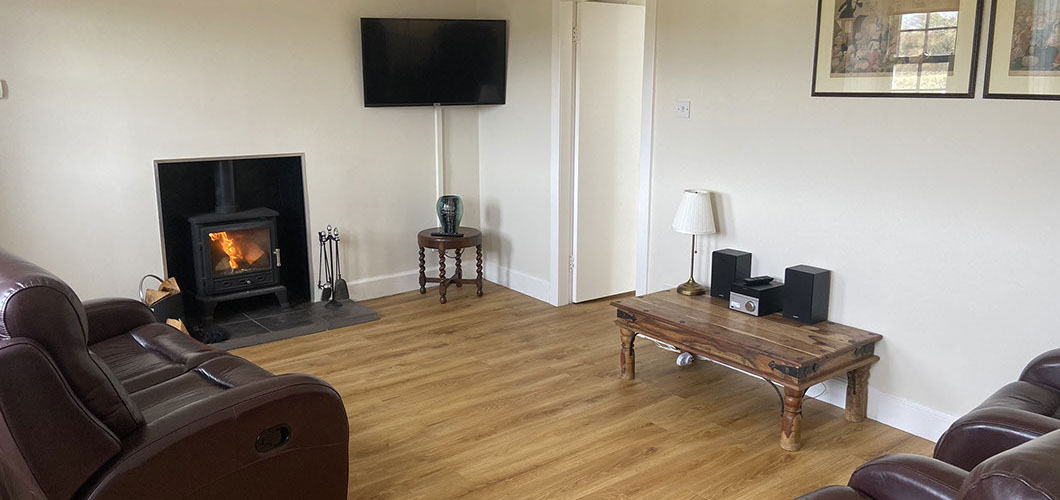 The cosy sitting room with tongue and groove paneling and a wood burning stove has comfortable furnishings and TV and music system.