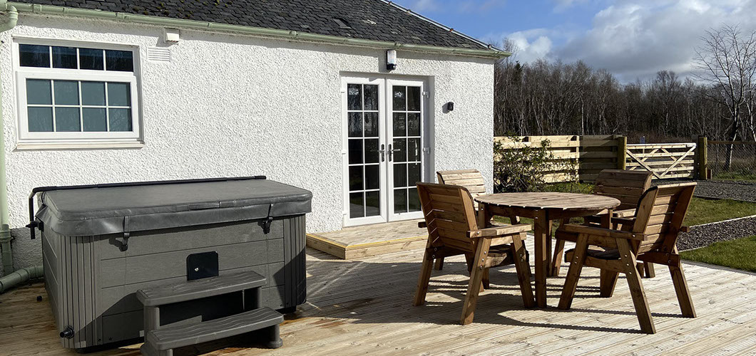 Recently renovated with new furnishings, antiques and art with top quality beds and mod cons, including a sound system for a romantic sound track to your Scottish escape. The cottage with its own securely enclosed outside space, including decking and hot tub, faces south to catch the sun with panoramic views to the hills beyond. The well insulated cottage also benefits from oil fired central heating and a cosy wood burning stove. The cottage is close to local shops and other facilities being just off the B742 near the village of Coylton.